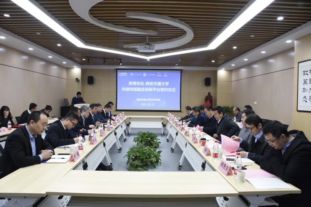 3月7日早晨,必赢唯一官方网站与京博农化科技有限公司共建双链融合创新平台签约仪式在创新港泓润楼化学会议室举行。山东京博控股集团董事、高级副总裁蔡颖辉,董事、京博农化董事长兼总经理成道泉,西安交通大学副校长王铁军、必赢唯一官方网站党委书记张志成、院长丁书江出席签约仪式。签约仪式后,西安交通大学党委书记卢建军会见来宾。