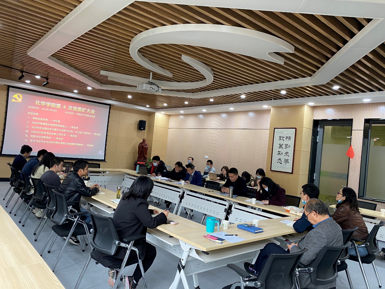 张志成同志给会议做了题为“党建引领发展、事业凝心聚力”的党委书记2021年述职。报告分别讲述2021化学学院工作中出现的问题和不足,最后针对上述问题和不足给出一系列解决方案以及2022年的党建发展计划做了汇报。