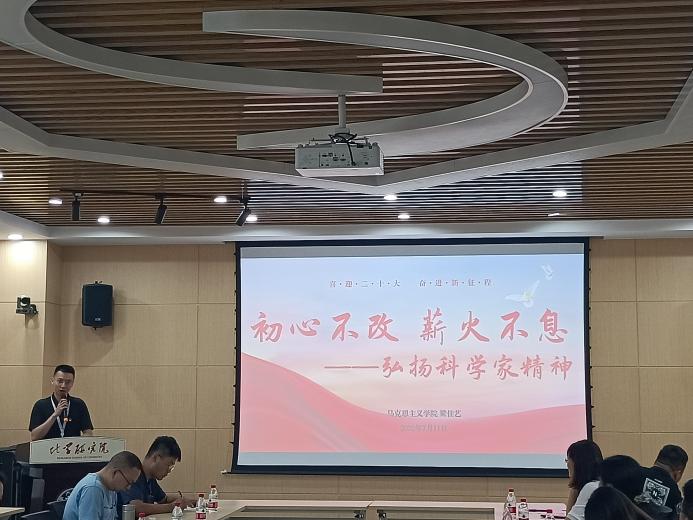 接下来,由马克思主义学院辅导员梁佳艺老师,作主题分享“初心不改,薪火不息——弘扬科学家精神”。他以习近平总书记在主持召开科学家座谈会上发表的讲话开启主题,强调了“科学无国界,科学家有祖国”的重要论述,播放了邓稼先、钱学森、袁隆平等为国家做出突出贡献科学家的纪录片。梁老师字句铿锵,他一心为国的精神着实令人敬佩,同时归纳总结了爱国、创新、求实、奉献、协同、育人的科学家的精神内涵,最后鼓励大家,在爱国的集体里做乐观的英雄!