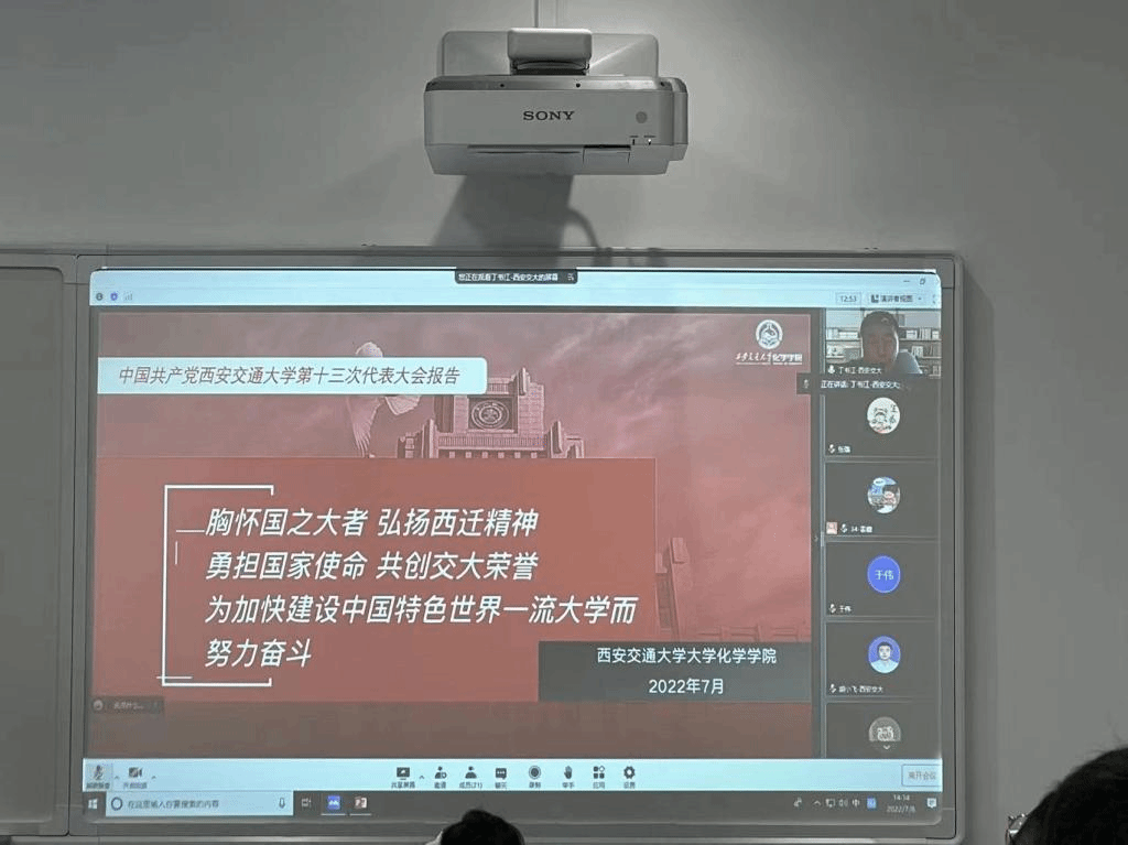 2022年7月8日下午,储能化学师生联合党支部召开组织生活会,邀请必赢唯一官方网站院长丁书江教授对学校第十三次党代会的整体脉络、深刻内涵和深远意义进行解读,会议由党支部书记于伟主持,支部全体党员参加,采取线上和线下结合的方式进行。