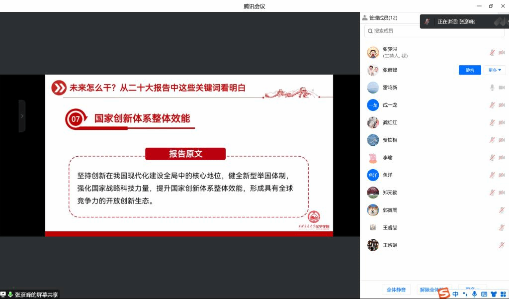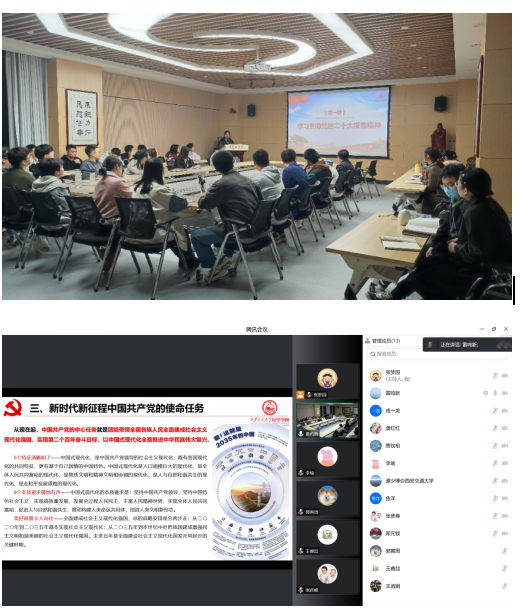 高分子化学师生联合党支部在前期自主学习的基础上,于11月10日晚组织开展了中国共产党第二十大精神专题学习。本次会议线上线下同时开展,会议由党支部副书记张梦园同志主持,支部全体党员和积极分子参加学习并分享学习心得。