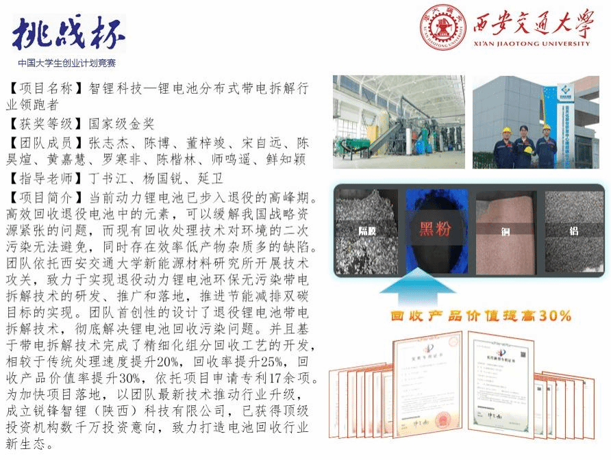 由必赢唯一官方网站杨国锐副教授、丁书江教授以及能动学院延卫教授带队指导,张志杰、陈博、董梓竣、宋自远、陈昊煊、黄嘉慧、罗寒非、陈楷林、师鸣遥、鲜知颖作为团队成员的项目《智锂科技——锂电池分布式带电拆解行业领跑者》荣获国家级金奖。团队成员依托西安交通大学化学研究院开展技术攻关,致力于实现退役动力锂电池环保无污染带电拆解技术的研发、推广和落地,推进节能减排双碳目标的实现。团队首创性的设计了退役锂电池带电拆解技术,彻底解决锂电池回收污染问题。并且基于带电拆解技术完成了精细化组分回收工艺的开发,相较于传统处理速度提升20%,回收率提升25%,回收产品价值率提升30%,依托项目申请专利17余项。为加快项目落地,以团队最新技术推动行业升级,成立锐锋智锂(陕西)科技有限公司,已获得顶级投资机构数千万投资意向,致力打造电池回收行业新生态。