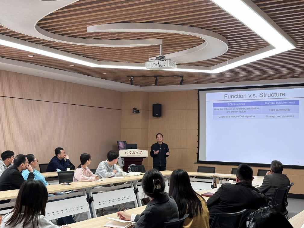 4月7日上午10时30分,来自清华大学的刘冬生教授以《核酸超分子水凝胶》为题,提出了全刚性分子构造的超分子水凝胶模型,可以避免由于高分子链熵卷曲产生的拓扑小孔,使之具有类似细胞外基质的超高通透性。此类水凝胶具有强度高、成胶快速、可注射、自愈合以及生物相容性好等特点,在此基础上,探索了其生物医学应用。研究证明了该凝胶可以载带干细胞,利用生物体损伤部分分泌的自体信号调控干细胞增殖与分化,在脊髓全断损伤修复研究中获得了优异的效果。
