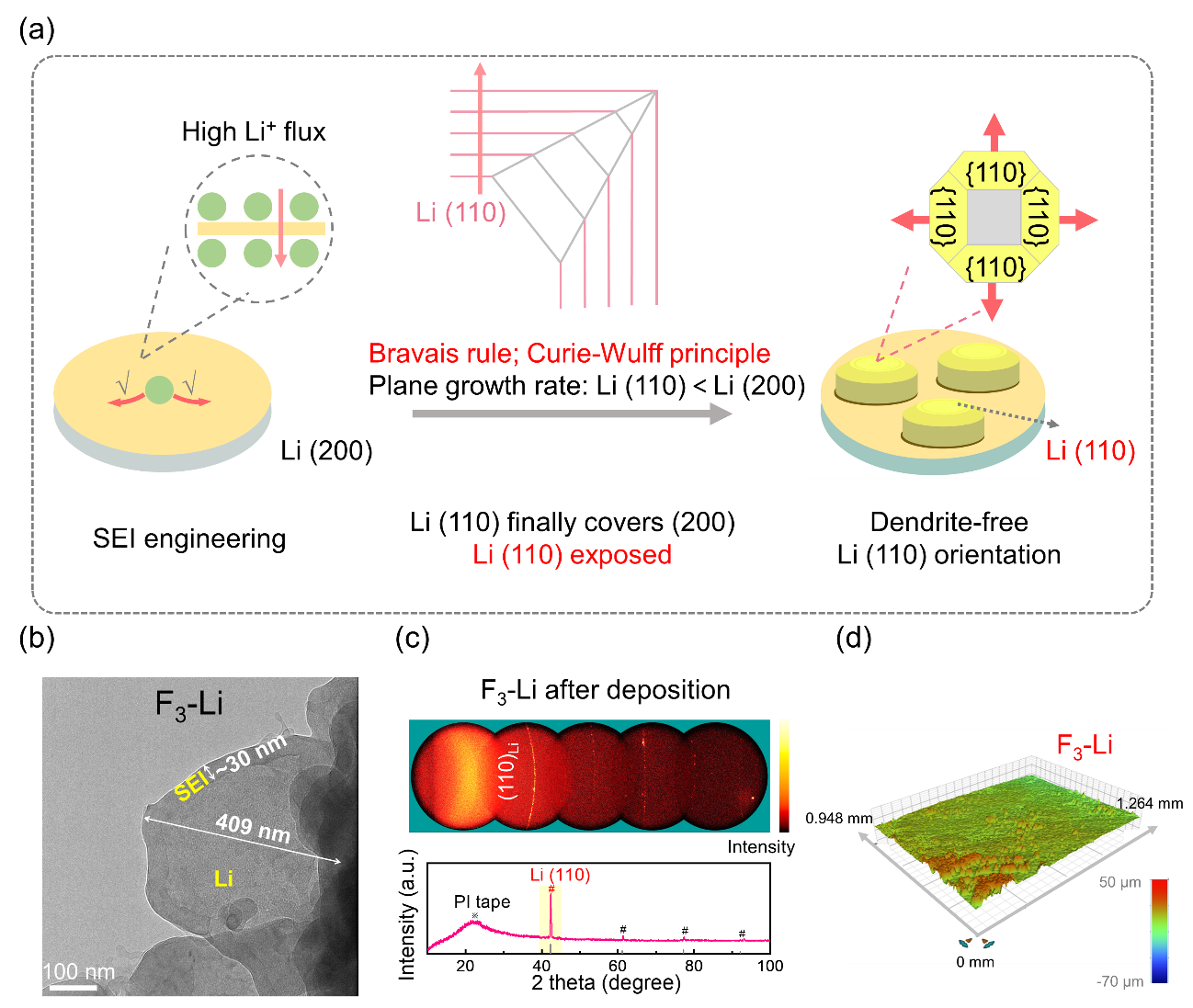 针对以上问题,西安交通大学丁书江教授、肖春辉教授课题组通过设计高通量固态电解质界面(SEI),诱导Li(110)取向的锂沉积,实现了无枝晶锂金属电池。如图1所示,通过简单高效的SEI工程,采用CF3Si(CH3)3(F3)滴涂策略,有效诱导高LiF-Si(CH3)3含量的高通量SEIF3-SEI)。加速了Li+的传输动力学,确保SEI下的高的Li+浓度,有利于的Li110)取向。通过Bravais规则和Curie-Wulff原理,解耦了SEI工程与锂电结晶择优取向之间的关系。多光谱技术与动力学分析表明,诱导的Li110)晶面进一步促进了Li原子的表面迁移,避免尖端聚集,从而形成了平面的、无枝晶的Li沉积。F3-SEI使Li||Li对称电池能够长期稳定336天以上。F3-SEI也能显著提高Li||LiFePO4Li|||NCM811扣式电池和软包电池的循环寿命。该工作对从晶体学角度抑制Li枝晶提供新的思路,促进性能优异的LMBs的发展,也为其他金属晶体的择优取向提供一定的指导。
