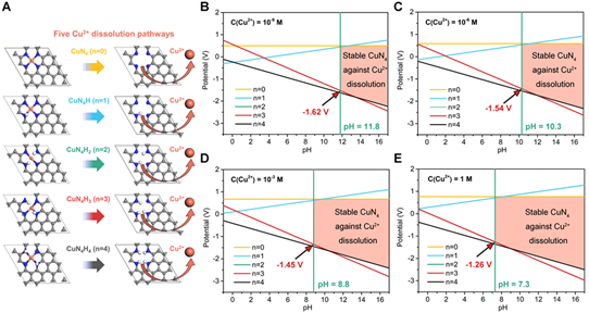 研究团队首先计算了在298.15K时,pH-电位的坐标空间中,Cu2+离子浓度分别为10-9 M、10-6 M、10-3 M和1 M时CuN4位点抵抗Cu2+溶解的热力学稳定性结果,如下图所示,橙色区域代表了CuN4处于热力学稳定的区域。结果表明,即使在Cu2+浓度较高(1 M)的环境中,Cu2+的溶解在酸性或中性条件下(溶液pH < 7.3)仍然在热力学上是放热的,而在pH ≥ 7.3时,若外加电位显著更负于-1.26 VSHE的也可能引起Cu2+的溶解。而在常见的Cu2+离子浓度下,如10-6 M或10-3 M,将电解质pH提升至超过10.3,并同时调整应用电位至高于-1.45 VSHE,可作为抑制CuN4的Cu2+溶解的一般策略。