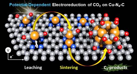 近日,必赢唯一官方网站丁书江团队苏亚琼教授课题组与华中科技大学夏宝玉教授课题组基于恒电位的第一性原理计算方法和多种实验表征手段,以Cu-N-C催化剂为研究模型,深入探究并提出了Cu单原子的动态烧结机理,并揭示了不同催化剂构型与eCO2RR性能之间的联系以及催化剂上C2产物的活性来源,同时就如何进一步控制反应中催化剂构型等重要问题进行了讨论。