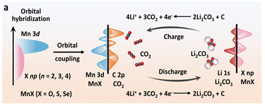 针对上述难题,西安交通大学何雅玲院士、郗凯教授团队,携手吉林大学徐吉静教授,提出了一种基于d-p轨道杂化调控的新型催化设计策略。通过调控过渡金属与硫族元素间的电子耦合,显著优化Li-CO₂电池氧化还原反应动力学。研究以锰基硫族化物(MnX, X=O, S, Se)为模型体系,结合密度泛函理论(DFT)计算与实验验证,系统揭示了阴离子化学对电子结构及催化性能的影响规律。结果发现,Mn与S之间的d-p轨道杂化作用最强,可有效提升金属中心电子密度,降低CO₂活化与Li₂CO₃分解能垒,从而显著加速反应动力学。这种催化策略使Li–CO₂电池在100 mA·g⁻¹电流密度下实现了高达19782 mAh·g⁻¹的优异放电容量,并在500 mA·g⁻¹条件下展现出超过430圈的出色循环稳定性。这项研究不仅提出了基于d-p轨道杂化调控的催化策略,有效加速了Li-CO₂电池中CO₂和Li₂CO₃的氧化还原反应动力学,也为其他金属–二氧化碳电池的催化材料设计提供了重要思路。研究成果以“通过d–p轨道杂化调控提升Li–CO₂电池氧化还原反应动力学”(d-p Orbital Hybridization Tailoring for Boosted Redox Kinetics in Li-CO₂ Batteries)为题发表于《先进功能材料》(Advanced Funtional Materials)上。