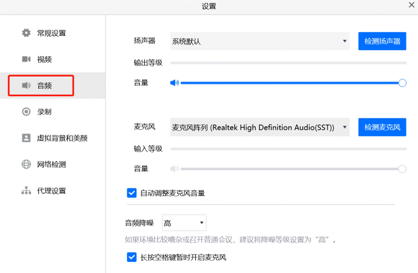 考生加入会议后进入等候区,为保证接入效果,可点击“扬声器和麦克风”进行语音设备测试,检测完音频效果后,等待监考老师批准加入面试会议。