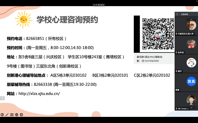 S1199S1200班心理委员向同学们普及了学校心理健康预约咨询方式,鼓励同学们如果遇到心理问题可以寻求专业帮助,切忌盲目自我诊断。